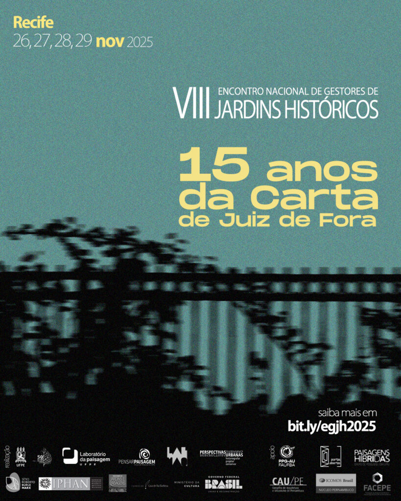 Acontece nessa semana, de 26 a 29 de novembro de 2025, o Encontro Nacional de Gestores de Jardins Históricos (ENGJH), na cidade do Recife, sendo a primeira vez que o evento acontece na região nordeste. Em sua 8ª edição, o evento tem como tema principal o aniversário de 15 anos da Carta dos jardins históricos brasileiros, ou Carta de Juiz de Fora, publicada na 1ª edição do evento e responsável por instruir a preservação dessa modalidade de bem cultural na realidade brasileira.